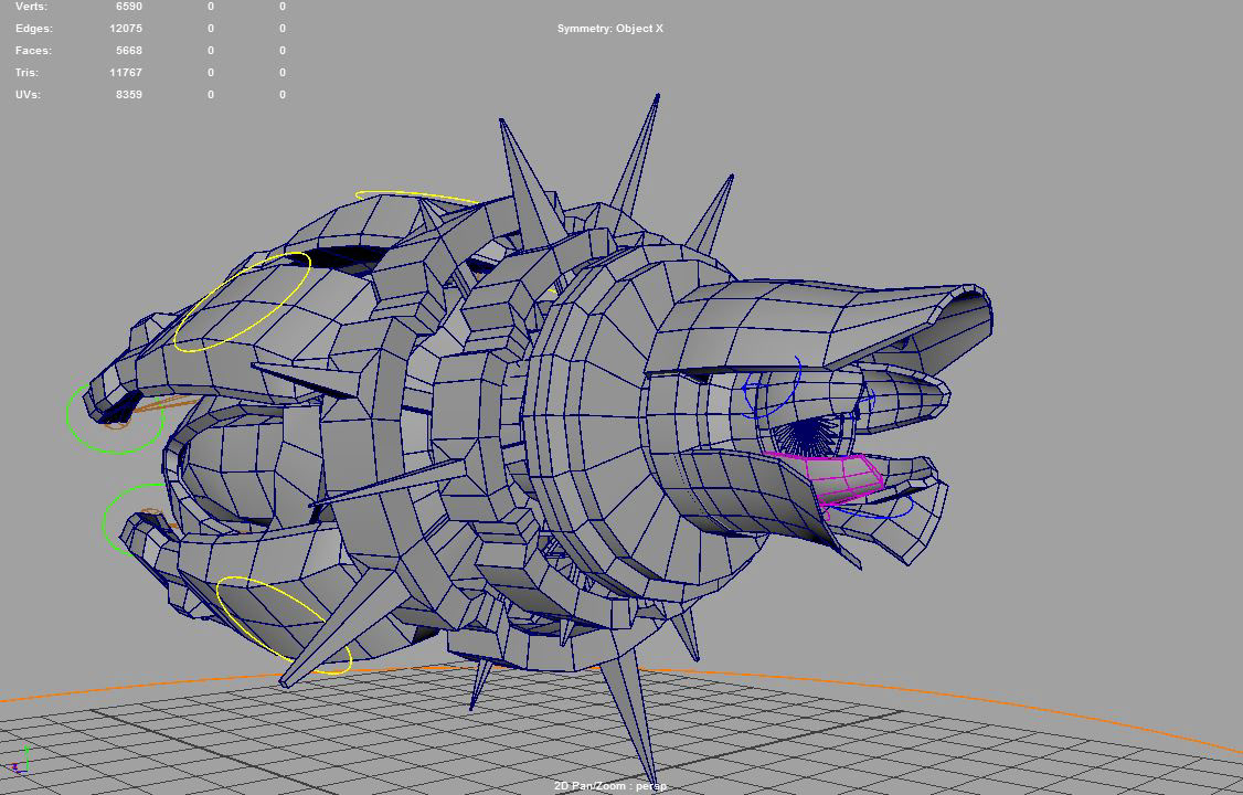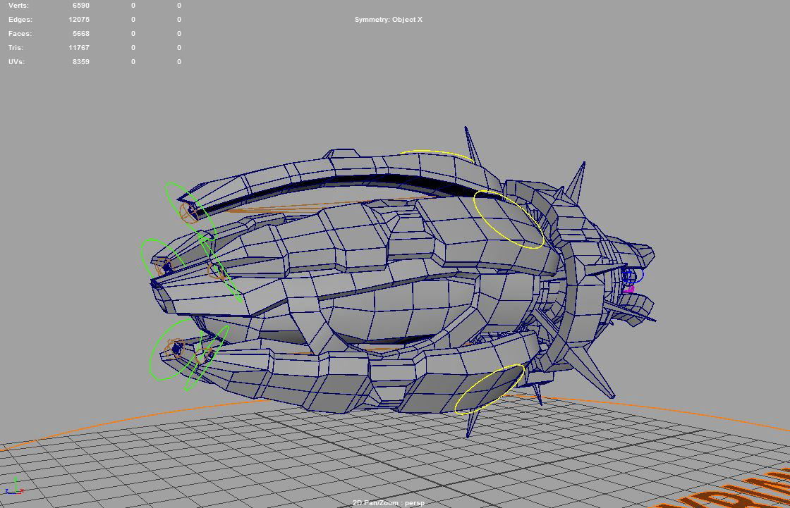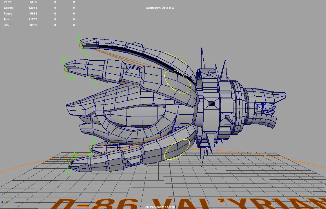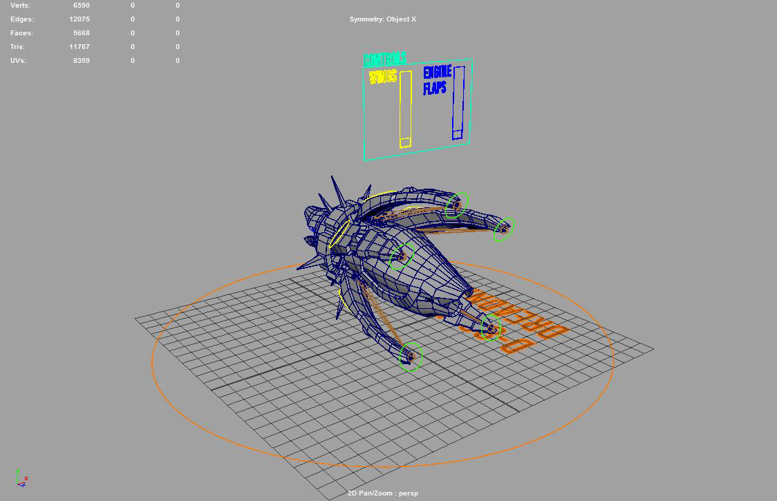 Ship I designed as a "playable character", based on my own concept. Ship has a basic rig set up that allows movement of the arms, laser sights, rear engine flaps, and engine rotation. Engine rotation is also animated and plays while the ship is in motion. Character sheet provided as a description of ships purpose and role in the game.